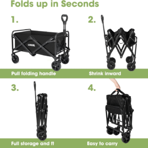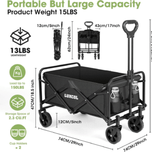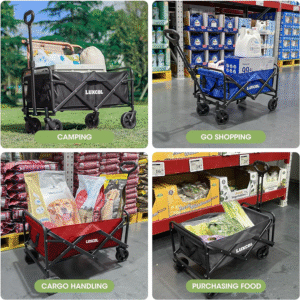 - 【Easy storage and space saving】 When camping, it is often difficult to carry equipment. In this case, a folding wagon can solve the problem. The wagon folds up to only 5 inches thick! Folding measures approximately 17 “x 5” x 24 “. There’s also a handy handle that you can put effortlessly in the trunk or behind the seat. Meanwhile, the portable wagon weighs only 15.4 pounds. It’s very lightweight, so you won’t feel burdened if you want to carry it around